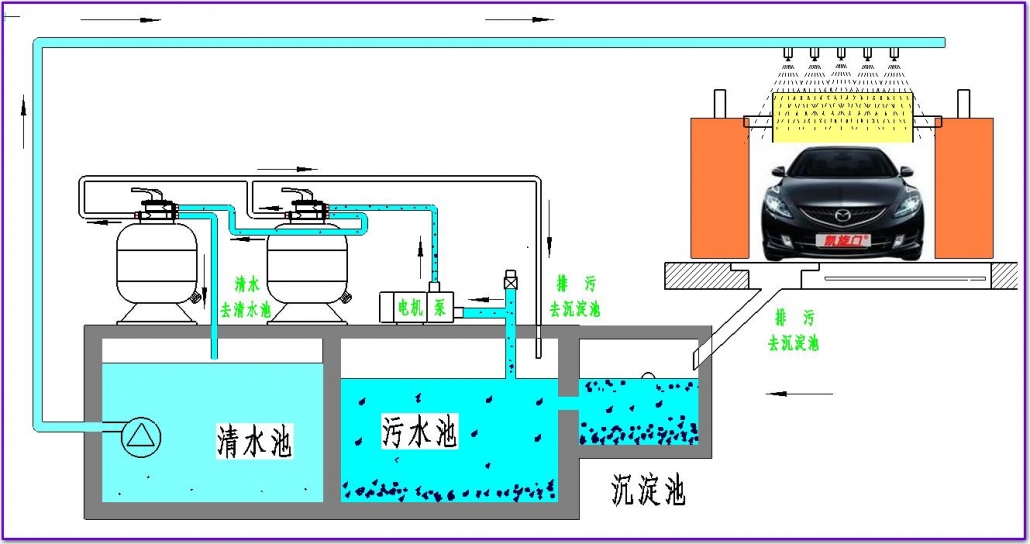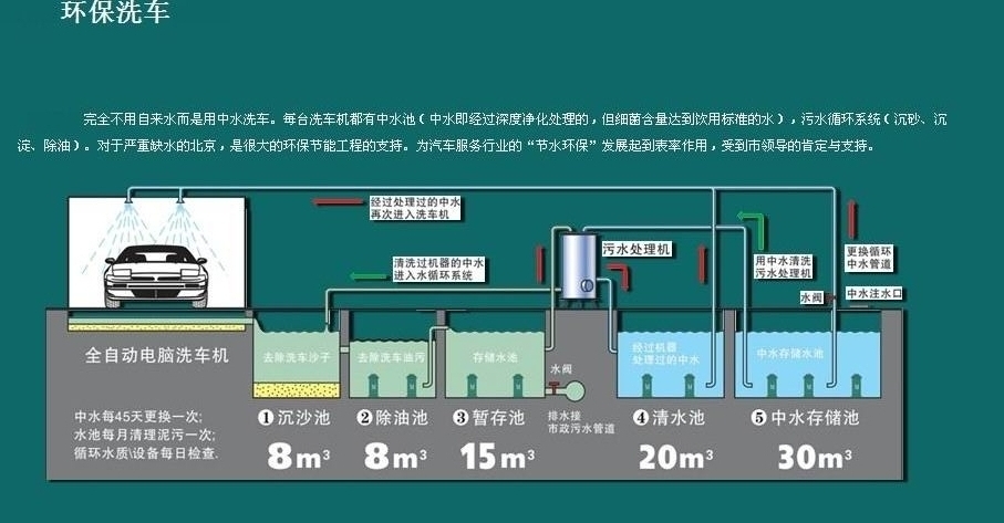 1.洗車循環水系統UItraCIean 在回收水方面將變得輕松經濟,洗車后廢水流入初沉淀池,大顆粒物體在此驚醒絮凝沉淀